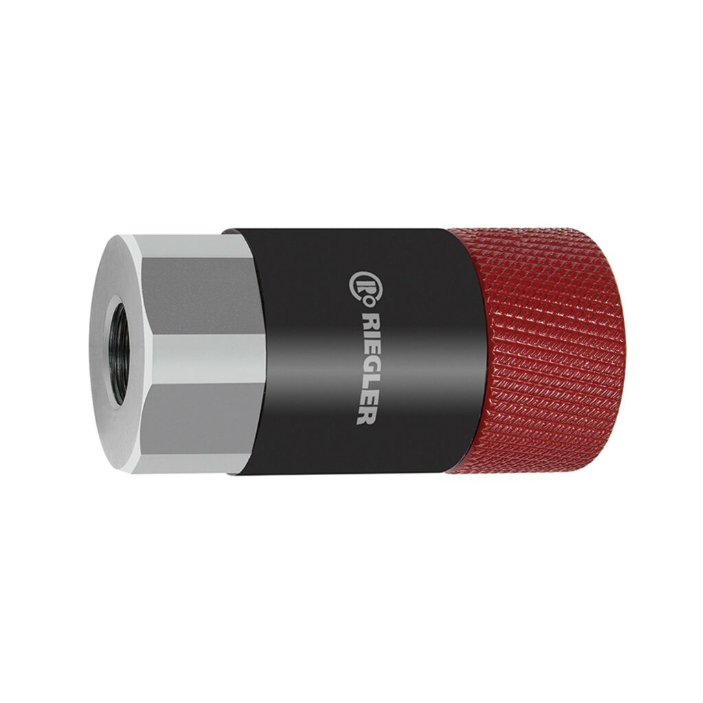 Dreh-Sicherheitskupplung NW 11, ISO 6150 C, Stahl, G 3/8 IG, 2-stufig, Betriebsdruck max. 25 bar, Temp. -20 °C bis 100 °C. Hochwertige, robuste und langlebige, mit einer Hand bedienbare Dreh-Sicherheitskupplung. Durch Eindrücken des Stecknippels, bis dieser hörbar rastet, wird eine sichere Verbindung hergestellt. Das Entkuppeln erfolgt über eine Linksdrehung der Hülse. Hierbei wird der anstehende Druck in der Kupplung und in der Leitung entlüftet, jedoch wird der Stecknippel über eine Sicherheitsklinke nicht komplett freigegeben. Erst nach einer Rechtsdrehung der Hülse kann der Stecknippel herausgezogen werden. Diese Kupplung entspricht dem ISO-Standard DIN EN ISO 4414, EN 983. Diese Sicherheitskupplung eignet sich nicht für die direkte Montage an pulsierendem Werkzeug. Wir empfehlen die Verwendung unserer Vibrationsdämpfer, gemäß ISO 6150, § 7.1. Einsatzgebiete: Pneumatik, Maschinen- und Anlagenbau, Fertigungsindustrie, Bergbau.