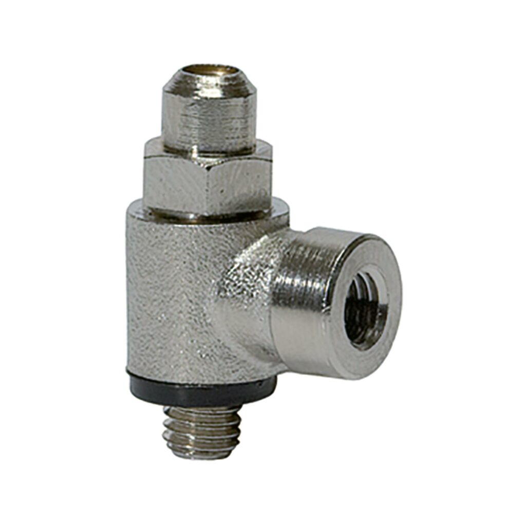 Drosselrückschlagventil, Abluftdrosselung (C) Gewindeanschluss M5 i., M5, PN max. 10 bar, Temp. -20 °C bis 80 °C, MS vern.. Zur Drosselung von Durchflussmengen und zur Regulierung der Kolbengeschwindigkeit von Zylindern. Kleine Baumaße, ideal bei engen Platzverhältnissen. Zum direkten Einschrauben am Ventil oder Zylinder. Die Varianten in Hohlschraubenbauweise sind während der Montage drehbar und nach dem Anziehen starr. Die Varianten mit drehbarer Steckverbindung können auch nach der Montage frei positioniert werden. Die eingesetzten Dichtungen und Schmierstoffe sind silikonfrei.