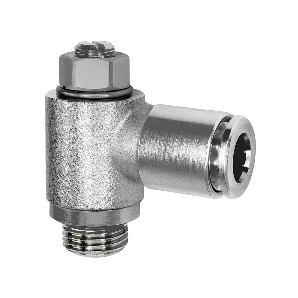 Drosselventil, beidseitig (B), Schlitzschraube, M5, Steckverbindung 4, drehb., 0 – 10 bar, -20 °C bis 80 °C, MS vern.. Zur Drosselung von Durchflussmengen und zur Regulierung der Kolbengeschwindigkeit von Zylindern. Kleine Baumaße, ideal bei engen Platzverhältnissen. Zum direkten Einschrauben am Ventil oder Zylinder. Die Varianten in Hohlschraubenbauweise sind während der Montage drehbar und nach dem Anziehen starr. Die Varianten mit drehbarer Steckverbindung können auch nach der Montage frei positioniert werden. Die eingesetzten Dichtungen und Schmierstoffe sind silikonfrei.