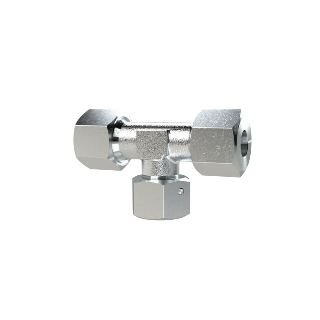 Einstellbare T-Verschraubung, Dichtkegel, 360° drehbar, Mutter M14x1,5 i., Rohr-Außen-Ø 6 mm, PN max. 630 bar, Stahl verzinkt.