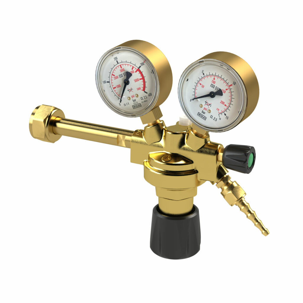 Flaschendruckminderer, Flaschendruck 200 bar, für nicht brennbare Gase, Gasart: Sauerstoff, Arbeitsdruck 0 – 10,0 bar. Einstufige Bauart in Pressmessing-Ausführung nach DIN EN ISO 2503, mit Absperrventil und Sicherheitsventil sowie je einem Manometer für Flascheninhalt und Arbeitsdruck. Flaschendruckminderer dienen zur Reduktion eines in einer Flasche mit einem bestimmten Fülldruck/Vordruck verdichteten, verflüssigten und gelösten Gases auf einen sehr viel niedrigeren, möglichst konstanten Hinterdruck/Überdruck und zwar dies möglichst unabhängig von Schwankungen des Vordruckes und des Durchflusses. Flaschendruckminderer mit Anschluss an Gasflaschen sind geeignet für die Druckreduktion verschiedener Gase. Sie haben eine Bauartzulassung nach DIN EN ISO 2503 für die Anwendungsbereiche Schweißen, Schneiden und verwandte Verfahren. Die Anschlüsse sind nach DIN 477 ausgeführt.