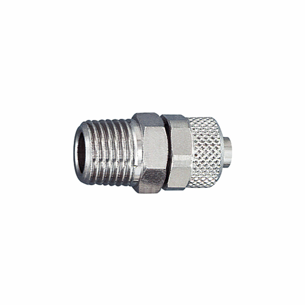 Gerade Einschraubverschraubung, AG konisch, R 1/8, für Schlauch 4/2 mm, SW 10, Arbeitsdruck max. 18 bar, Messing vernickelt.
