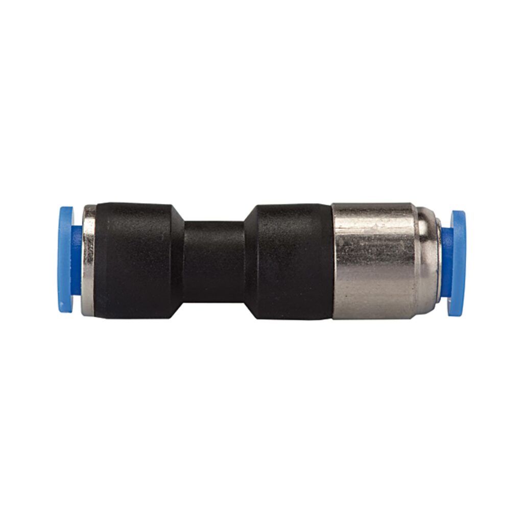 Gerade Steckverbindung »Blaue Serie«, selbstabsperrend, für Schlauch-Außen-Ø 4 mm, pmax. 10 bar, Kunststoff/MS vern.. Die Druckluftversorgung wird sofort komplett abgesperrt, sobald der Schlauch vom Verbinder gelöst wird. Der Durchfluss ist nur bei fest eingestecktem Schlauch gewährleistet.