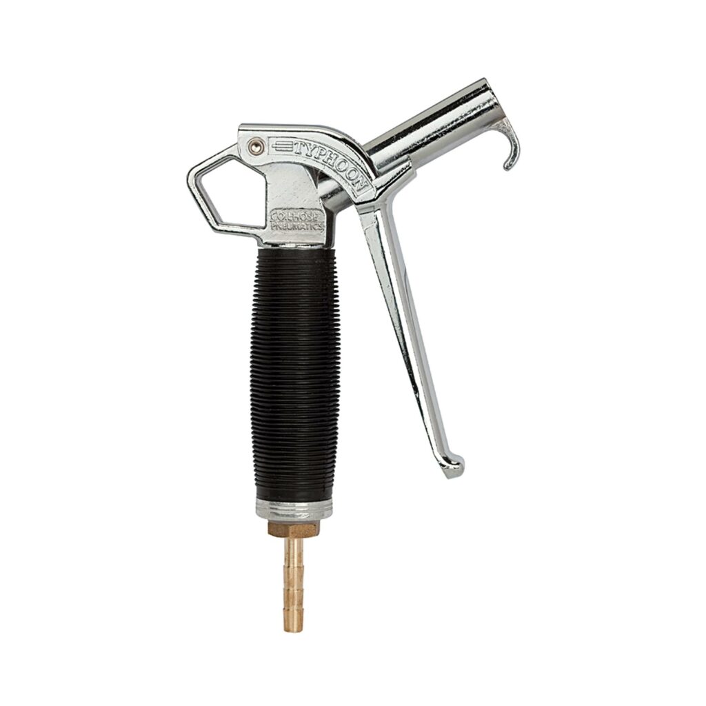 Hochleistungs-Blaspistole »Typhoon«, ohne Düse, Aluminium, Betriebstemperatur -10 °C bis 50 °C, PN max. 10 bar, Tülle LW 6. Stufenlos regelbare, leichtgewichtige und ergonomisch hervorragende Hochleistungs-Blaspistole mit ausgesprochen starker Blasleistung. Gegenüber herkömmlichen Standardpistolen hat die »Typhoon« eine ca. 3-fach höhere Blasleistung und liegt auch bei voller Druckbeaufschlagung leicht und sicher in der Hand. Zum Ausblasen von schwer zugänglichen Stellen sind Verlängerungsrohre lieferbar. In Verbindung mit Sicherheitsdüsen erfüllt diese Pistole eine Vielzahl von Anwendungsmöglichkeiten und sicherheitstechnischen Anforderungen.