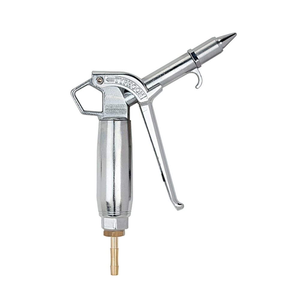 Hochleistungs-Blaspistole »Typhoon pro«, Aluminium verchromt, PN max. 10 bar, Tülle LW 6. Stufenlos regelbare und ergonomisch hervorragende Hochleistungs-Blaspistole in Vollmetallausführung mit ausgesprochen starker Blasleistung. Gegenüber herkömmlichen Standardpistolen hat die »Typhoon pro« eine ca. 3-fach höhere Blasleistung und liegt auch bei voller Druckbeaufschlagung leicht und sicher in der Hand. Resistent gegen Chemikalien und chemische Lösungsmittel, auf Grund der verchromten Oberfläche leicht zu reinigen!