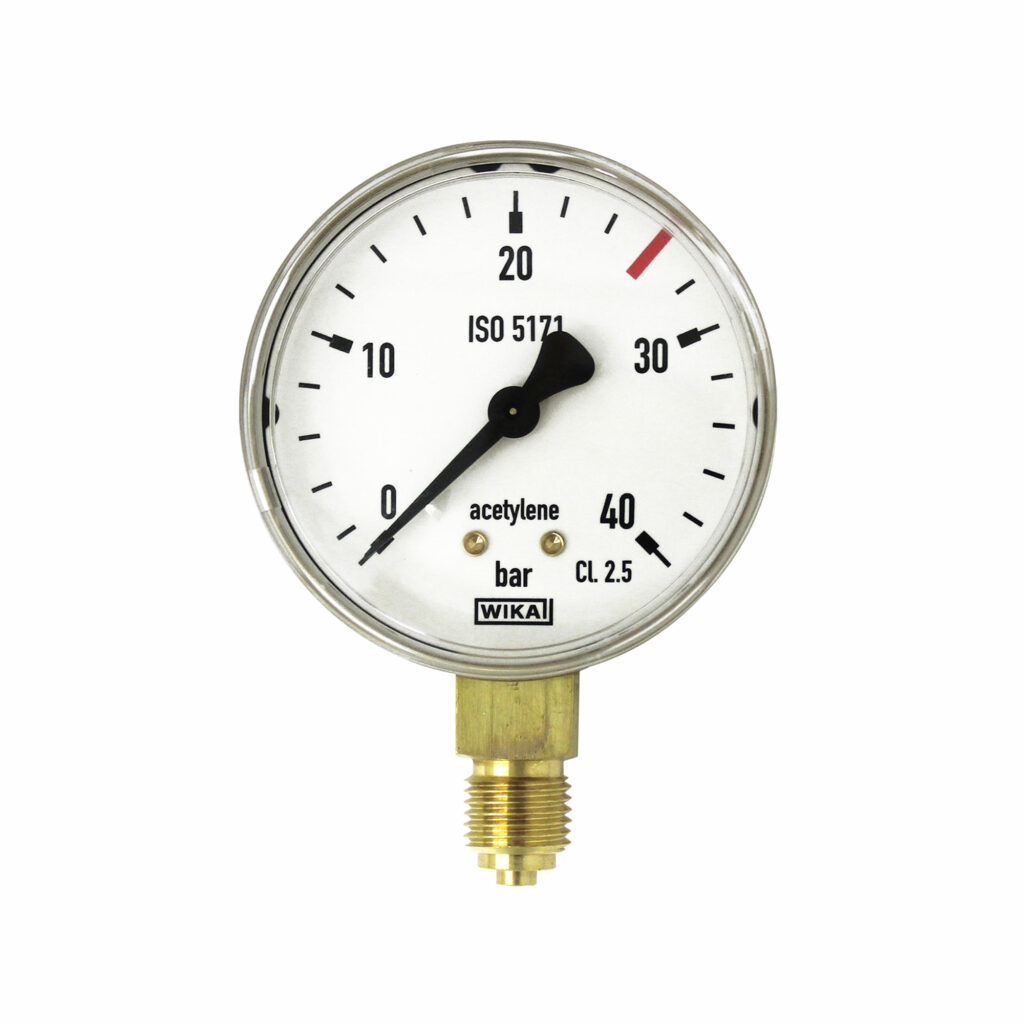 Inhaltsmanometer für Flaschendruckminderer, Stahlgehäuse, Acetylene, G 1/4, Anschluss radial unten, 0 – 40 bar, Ø 63.