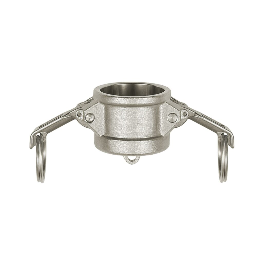 Kamlok-Verschlusskappe für Schnellkupplungsstecker-Ø 32 mm, Typ DC, ES 1.4401, BG 3/4, Druck max. 16 bar, Temp. -20 °C bis 95 °C. Hochwertiges, robustes Universalkupplungssystem für Klemmschaleneinband zur schnellen und einfachen Verbindung zweier Schläuche bzw. eines Schlauchs mit einem Maschinenanschluss. Jeweils ein Vater- und ein Mutterteil werden durch Umlegen der Hebelarme miteinander verbunden. Dabei wird der Schlauch nicht verdreht! Die Kamlok-Edelstahlkupplung ist konzipiert für den Einsatz bei aggressiven Medien in der chemischen und petrochemischen Industrie, der Stahlindustrie, im Schiffsbau, in der Landwirtschaft etc. Alle Kamlok-Schnellkupplungsdosen und Kamlok-Verschlussdosen werden mit NBR-Dichtung geliefert.