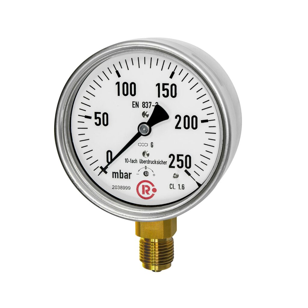 Kapselfedermanometer, 10-fach überlastbar, Gehäuse CrNi-Stahl, Anschl. radial unten, G1/4, Gütekl. 1,6, Messber. 0-40 mbar, Ø 63 . 10-fach überlastbar, mit Nullpunktkorrektur.