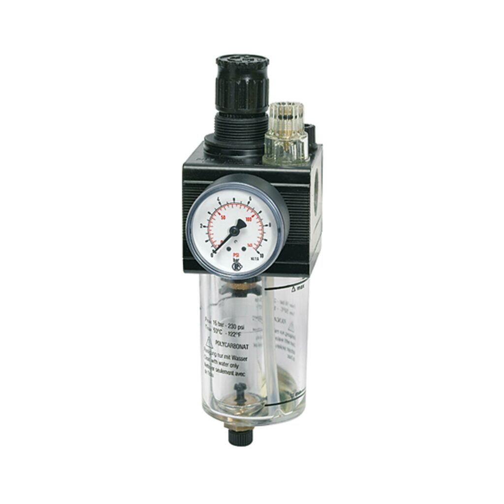 Kombi-Wartungseinheit mit Polycarbonatbehälter und Handablassventil, BG 1, G 1/4, PE max. 16 bar, Regelbereich 0,5 – 10 bar. Filter, Druckregler und Nebelöler in einem Gerät vereinigt, extrem platzsparende Bauweise. Druckeinstellung kann durch Eindrücken des Handrads arretiert werden. Öleinfüllung unter Druck möglich.