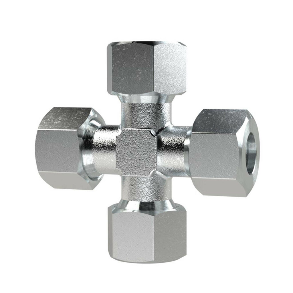 Kreuz-Verschraubung, Rohr-Außen-Ø 6 mm, PN 630, SW1 17, SW2 12, Stahl verzinkt. Kreuz-Verschraubung, schwere Ausführung