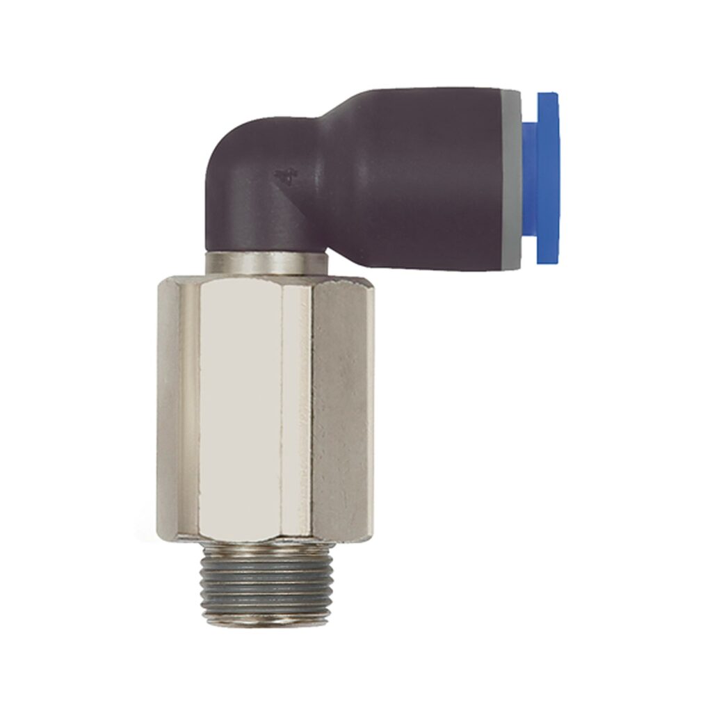 L-Steckverschraubung »Blaue Serie« lang, drehbar, R 1/8 a., für Schlauch-Außen-Ø 4 mm, pmax kurzzeitig 15 bar, Kunststoff/MS vern.. Unsere Schnellsteckverbinder-Serie aus Kunststoff bzw. vernickeltem Messing. Die Teile sind einsetzbar in Verbindung mit Kunststoffschläuchen und Kunststoffrohren.