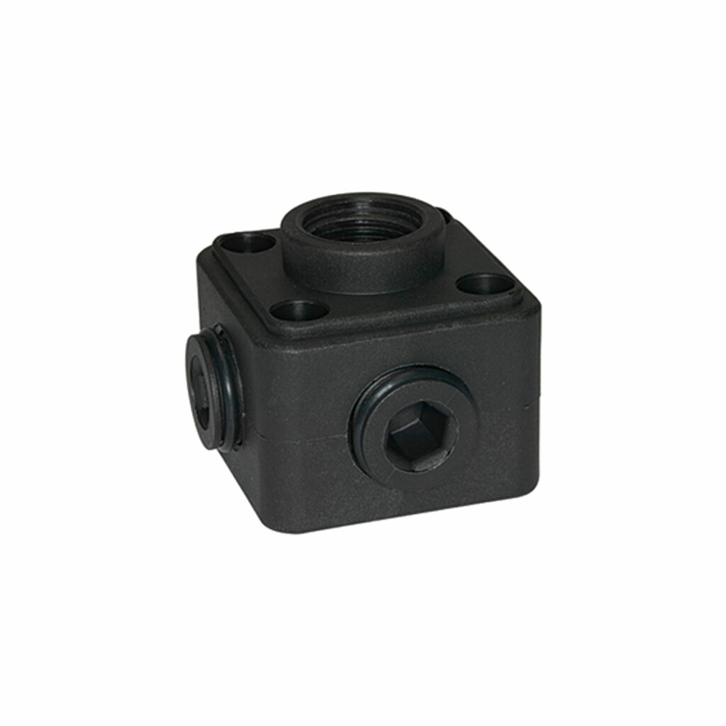 Luftverteilerdose, für Serie »speedfit«, Kunststoff, schwarz, 5 x G 1/2 IG, mit 4 selbstdichtenden Kunststoffschrauben. Mit 5 x G 1/2 Innengewinde zum Einschrauben von Adaptern und mit 4 selbstdichtenden Kunststoffschrauben für die Gewindeöffnungen sowie G 1/2 für eine Schnellkupplung.