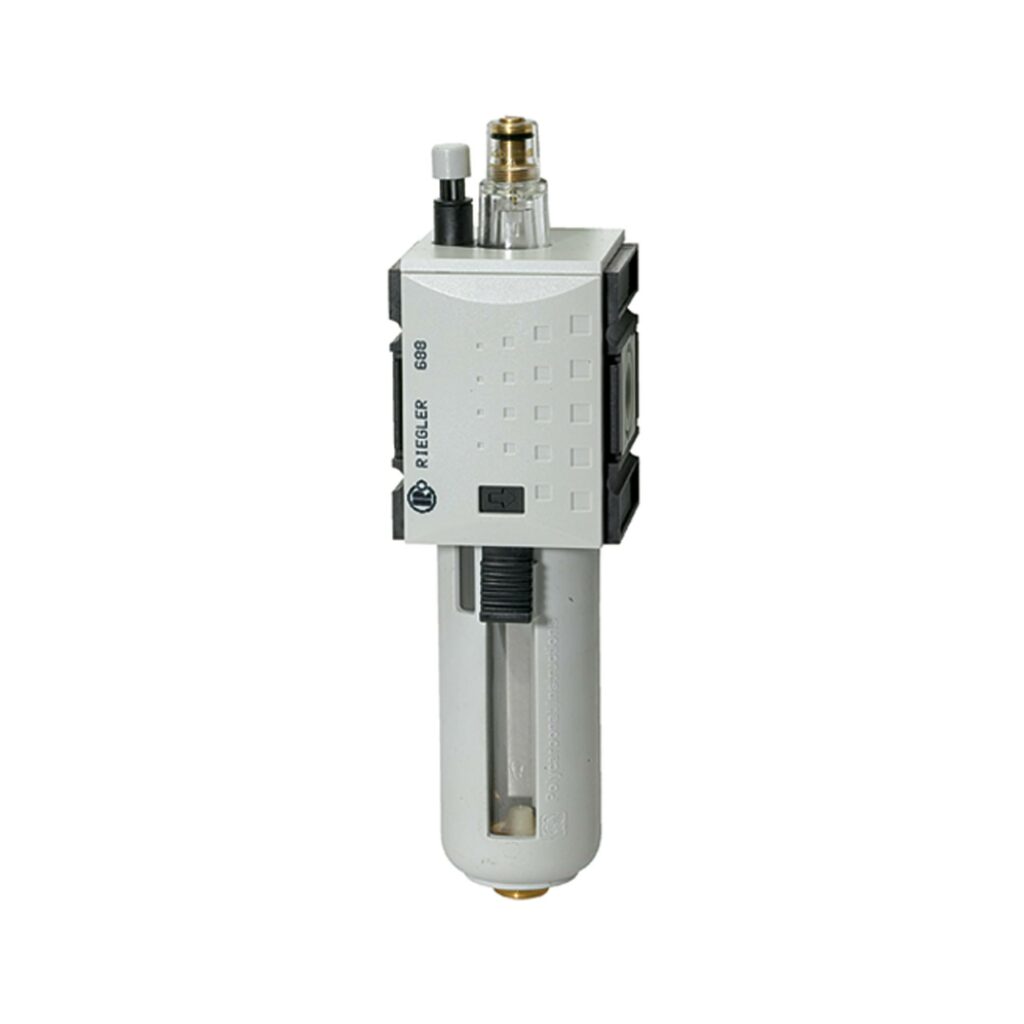 Nebelöler »FUTURA« mit Polycarbonatbehälter und Schutzkorb, BG 1, G 1/4, Eingangsdruck max. 16 bar, Temp. -10 °C bis 50 °C. Nebelöler in modernem Design mit hervorragenden Durchflusswerten. Das Gerät bietet die Möglichkeit der automatischen Ölnachfüllung. Hierzu muss am Gewindestutzen des Ölbehälters ein Schlauch angeschlossen werden. Bei Betätigung des Öleinfüllknopfs oben am Gerät öffnet sich eine Venturidüse, welche durch Unterdruck Öl in den Behälter saugt.