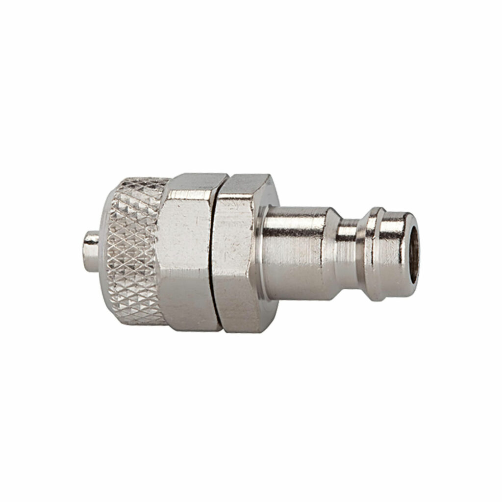 Nippel für Kuppl. NW 5, Messing vern., für Schlauch 6×4, SW 14, Betriebsdruck 0 – 35 bar, Mediums-/Umgebungstemp. -20°C bis 100°C.