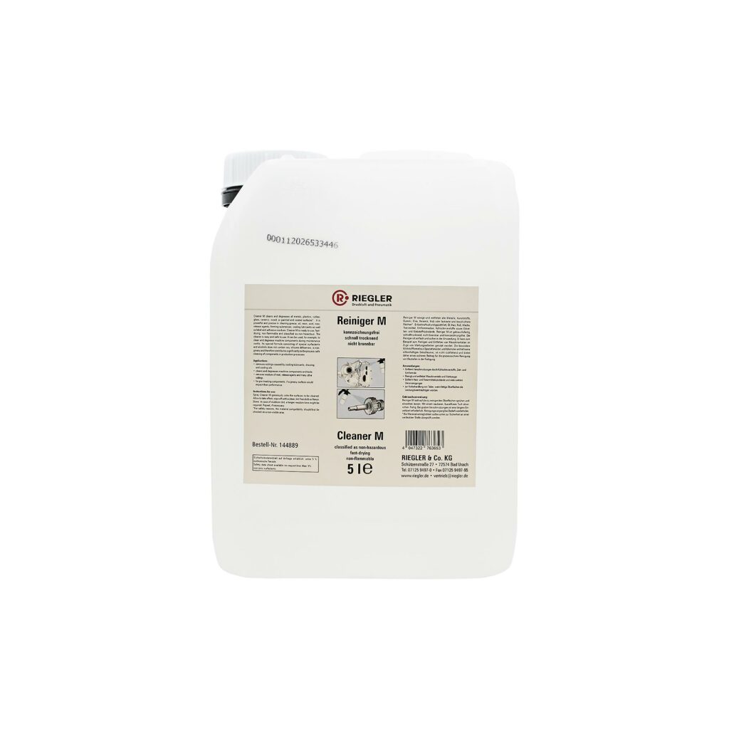 Reiniger M, 5 L, kennzeichnungsfrei, schnell trocknend, nicht brennbar. Reinigt und entfettet alle Metalle, Kunststoffe, Gummi, Glas, Keramik, Holz oder lackierte und beschichtete Flächen. Löst kraftvoll und gezielt Fett, Öl, Harz, Ruß, Wachs, Trennmittel, Umformmedien, Kühlschmierstoffe sowie Etiketten- und Klebstoffrückstände.