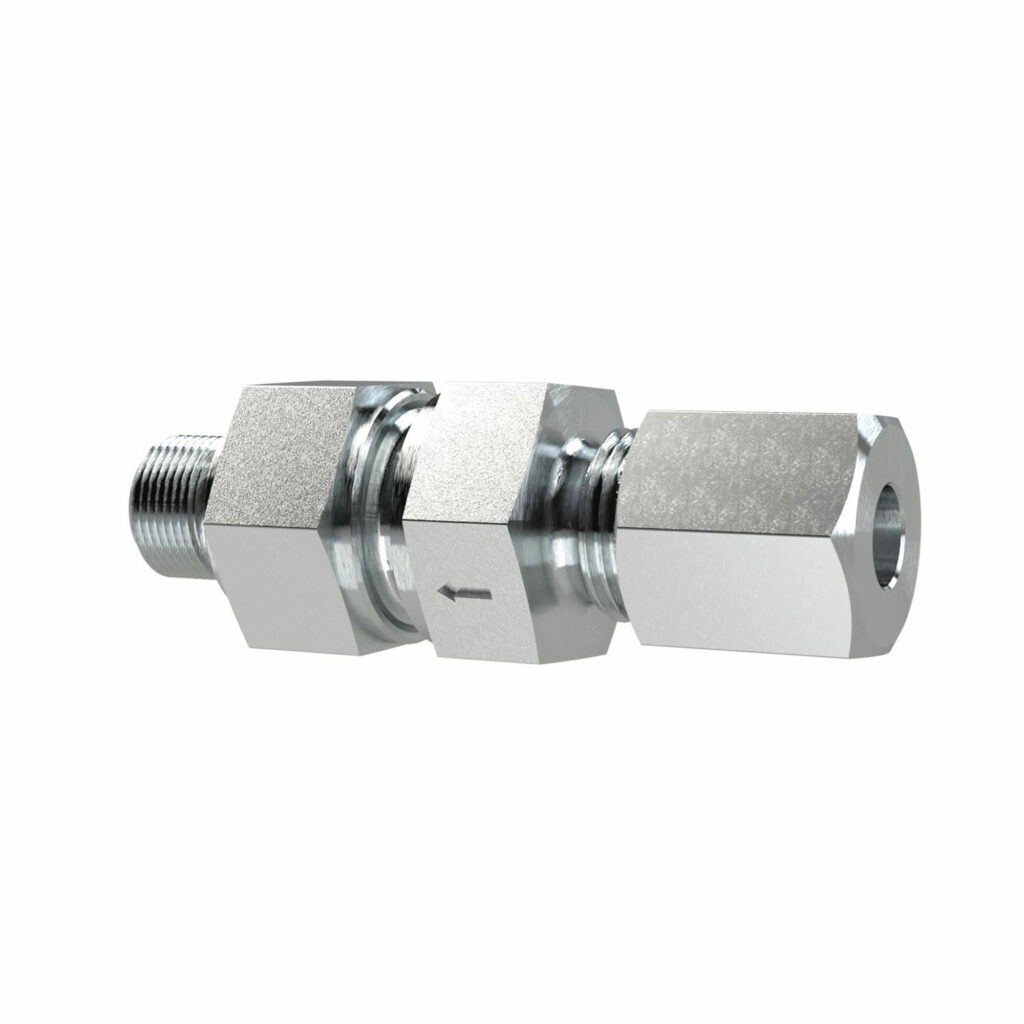 Rückschlagventil, G1/4a.,Schneidring-Gew., Rohr-Außen-Ø 6, PN max. 400, SW1 17, SW2 19, SW3 19, Stahl verz.,Öff.-Druck:0,8-1,2bar . Rückschlagventil, Durchflussrichtung Schneidring zum Gewinde, Außengewinde zylindrisch, schwere Ausführung