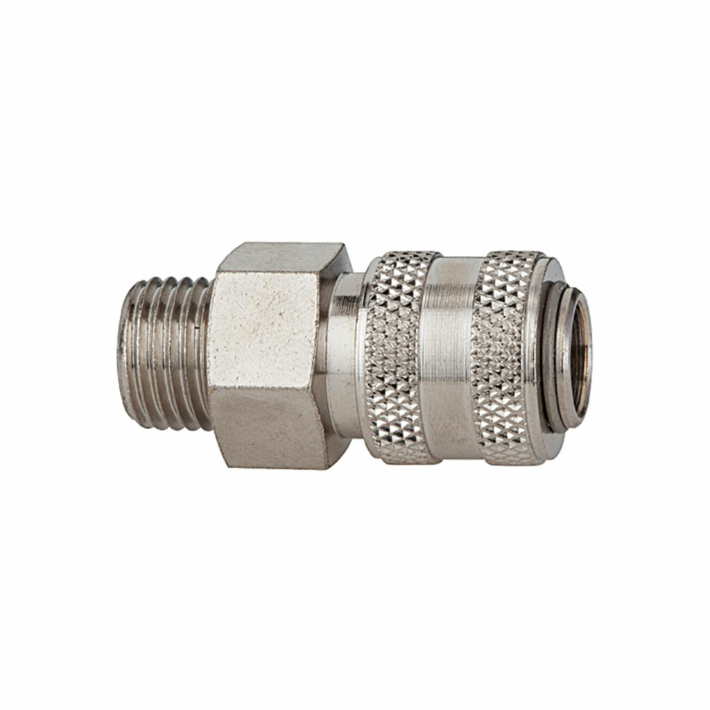 Schnellverschlusskupplung NW 5 »connect line«, MS vern., G 1/8 AG, Betriebsdr. 0 – 35 bar, Mediums-/Umgebungstemp. -20°C bis 100°C. Preiswerte, einseitig absperrende Einhand-Schnellverschlusskupplung mit kleinen Baumaßen und großem Durchgang bei geringem Druckabfall. Um Verletzungen oder den «Peitschenhiebeffekt» zu vermeiden, empfehlen wir den Stecknippel beim Entkuppeln mit einer Hand festzuhalten. Einsatzgebiete: Pneumatik, Mess-, Regel- und Steuerungstechnik, Fertigungsindustrie, Medizintechnik, Chemie-/ Pharmaindustrie, Automotive, Nahrungsmitteltechnik.
