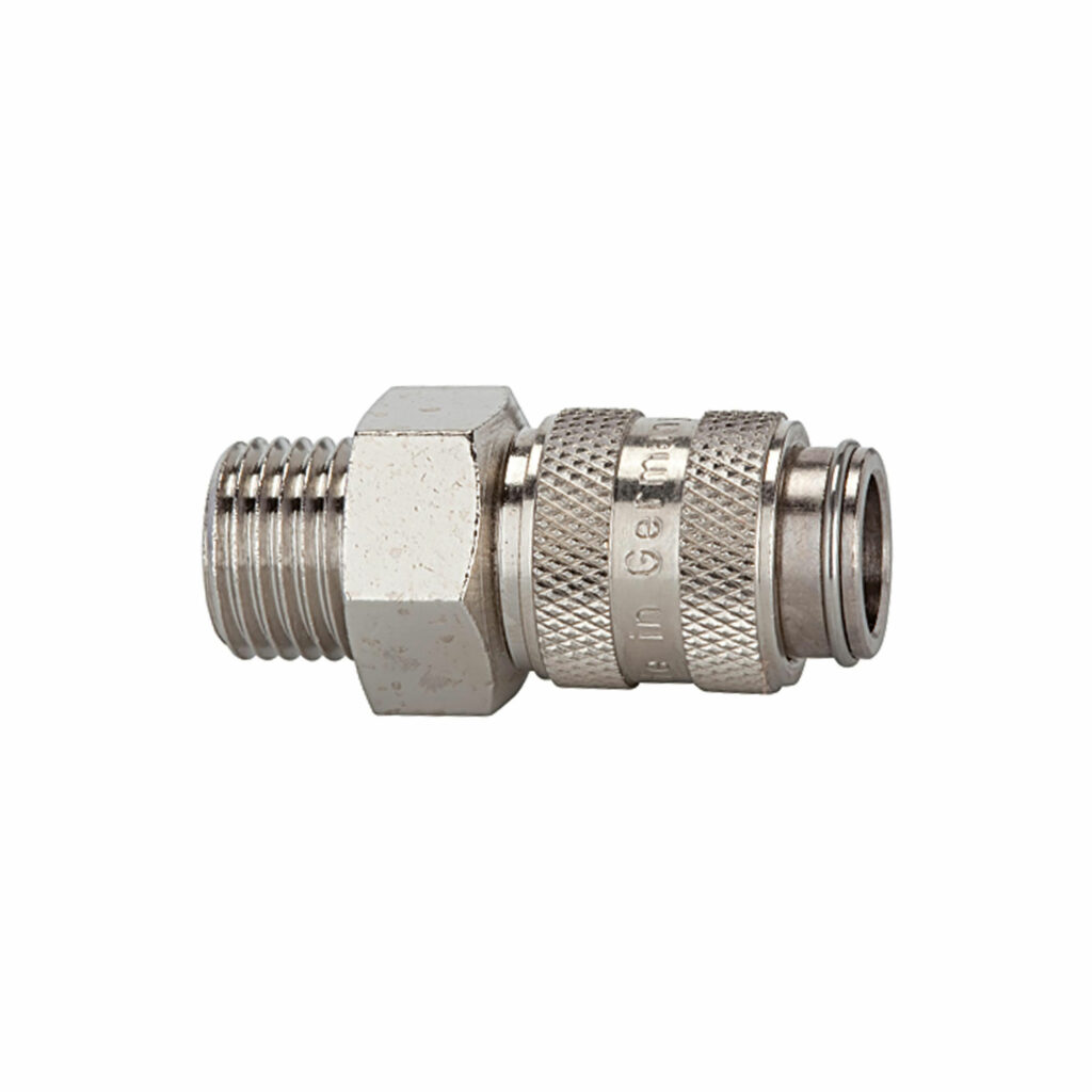 Schnellverschlusskupplung NW 5, Messing vernickelt, G 1/8 AG, Betriebsdruck 0 – 35 bar, Mediums-/Umgebungstemp. -20 °C bis 100 °C. Einseitig absperrende Einhand-Schnellverschlusskupplung mit kleinen Baumaßen und großem Durchgang bei geringem Druckabfall. Um Verletzungen oder den «Peitschenhiebeffekt» zu vermeiden, empfehlen wir den Stecknippel beim Entkuppeln mit einer Hand festzuhalten. Einsatzgebiete: Pneumatik, Mess-, Regel- und Steuerungstechnik, Fertigungsindustrie, Medizintechnik, Chemie-/ Pharmaindustrie, Automotive, Nahrungsmitteltechnik.