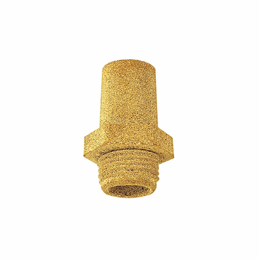 Sinterbronce-Schalldämpfer, Sechskant, G 1/8, SW 13 mm, Betriebsdruck 0 – 8 bar, Betriebstemperatur -10 °C bis 250 °C. Zur Reduzierung von Abluftgeräuschen an pneumatischen Anlagen.