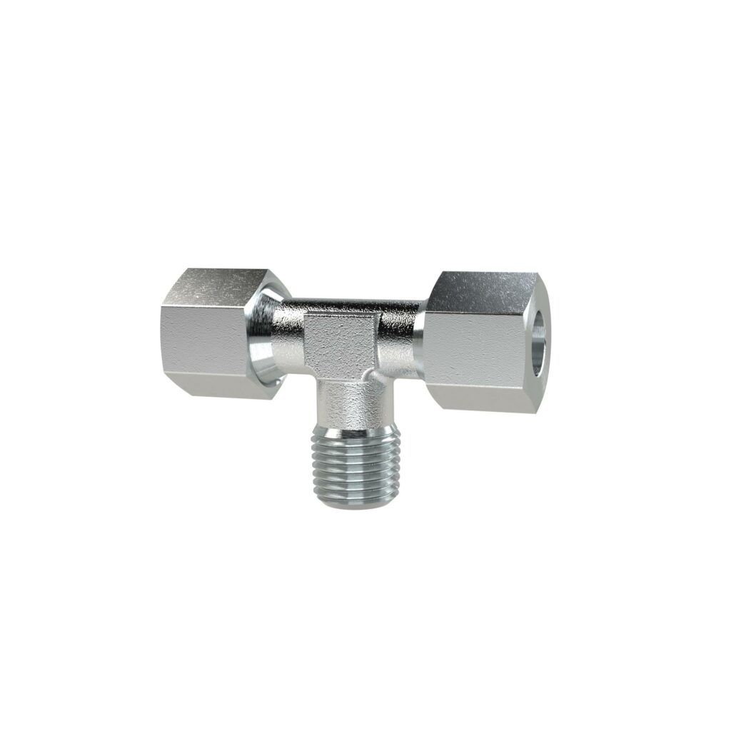 T-Einschraubverschraubung, R 1/4 a., Rohr-Außen-Ø 6 mm, PN max. 630 bar, SW1 17, SW2 12, Stahl verzinkt. T-Einschraubverschraubung, Außengewinde konisch nach ISO 7-1, schwere Ausführung