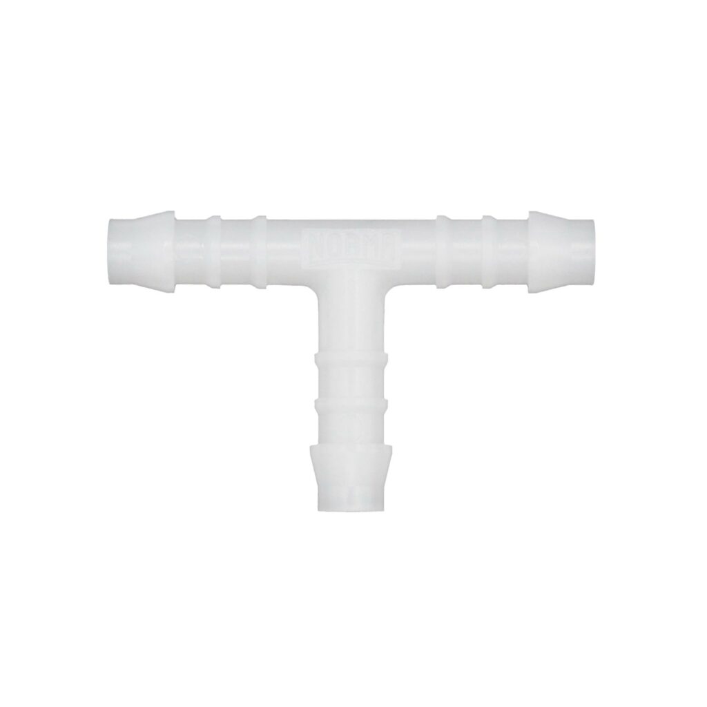 T-Schlauchverbindungsstutzen, für Schlauch LW 3 mm, Arbeitsdruck max. 10 bar, Temperaturbereich -40 bis 80 °C, POM. Schlauchverbindungsteile mit hoher Festigkeit, Zähigkeit, geringem Gewicht, Abriebfestigkeit und großer Schlagfestigkeit.