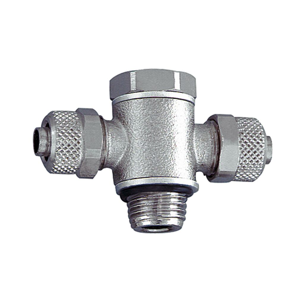 T-Schwenkverschraubung, mit O-Ring, M5 a., für Schlauch 5/3 mm, SW 8, Arbeitsdruck max. 18 bar, Messing vernickelt.