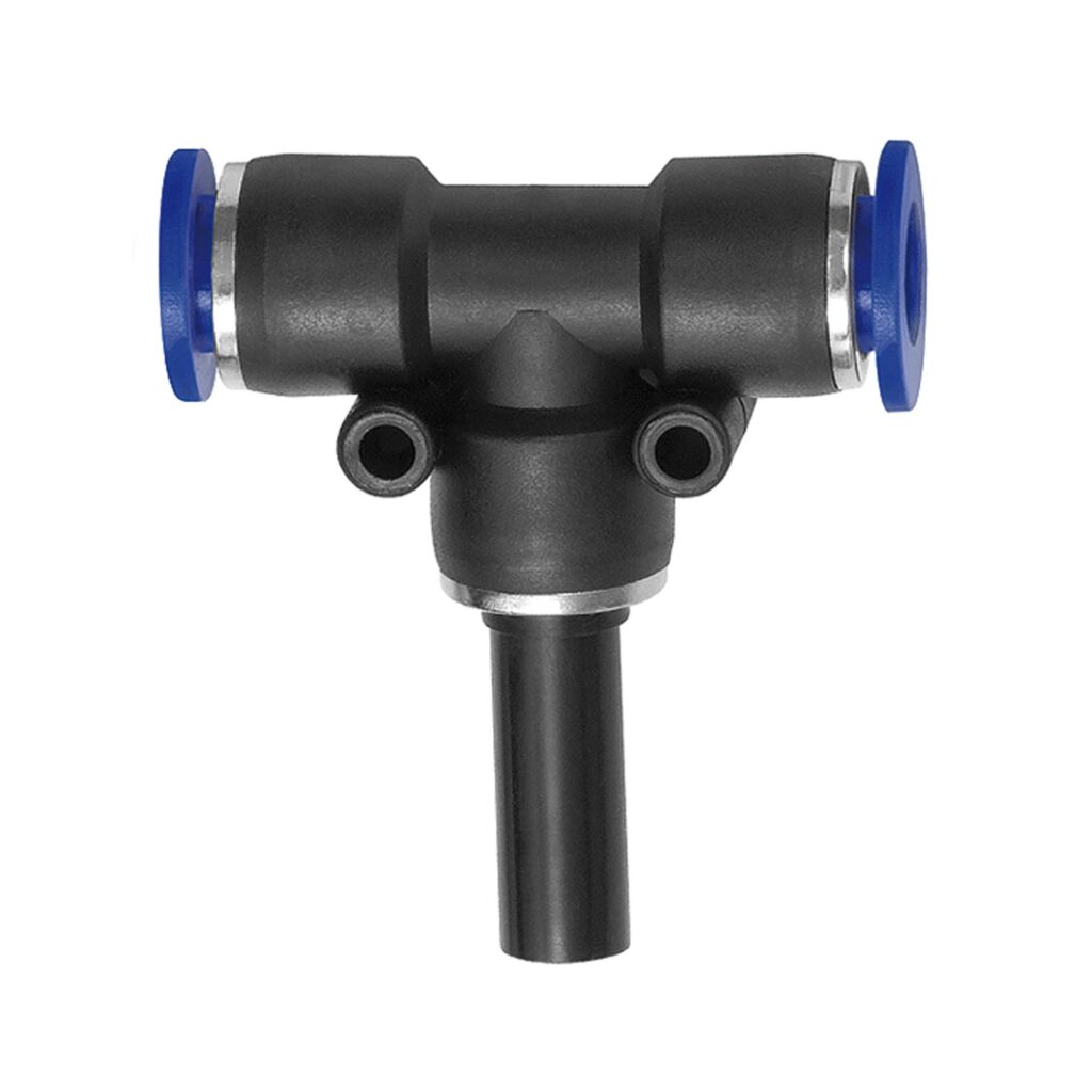 T-Steckverbindung, Stecknippel 4 »Blaue Serie«, für Schlauch-Außen-Ø 4 mm, pmax kurzzeitig 15 bar, Kunststoff. Unsere Schnellsteckverbinder-Serie aus Kunststoff bzw. vernickeltem Messing. Die Teile sind einsetzbar in Verbindung mit Kunststoffschläuchen und Kunststoffrohren.