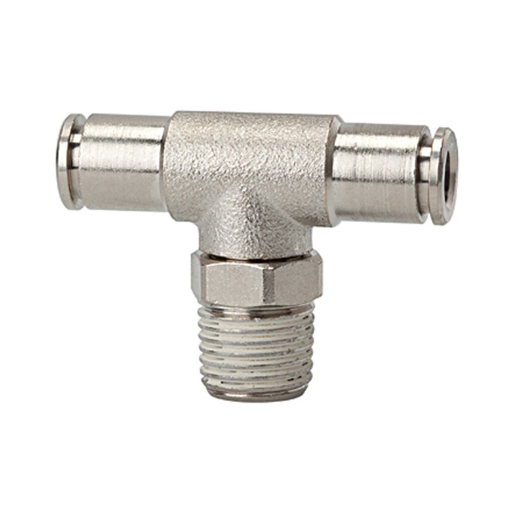 T-Steckverschraubung »metallica«, drehbar, R 1/8 a., für Schlauch-Außen-Ø 4 mm, Arbeitsdruck -0,98 bis 16 bar, Messing vernickelt . Schnellsteckverbindungen komplett aus Messing vernickelt. Die Teile mit zylindrischem Gewinde sind mit einem FKM-O-Ring ausgestattet. Die konischen Gewinde sind mit der Dispersion preCOTE 5 beschichtet, so dass alle Verbindungen dieser Serie auch bei hohen Temperaturen eingesetzt werden können (Medium Druckluft).