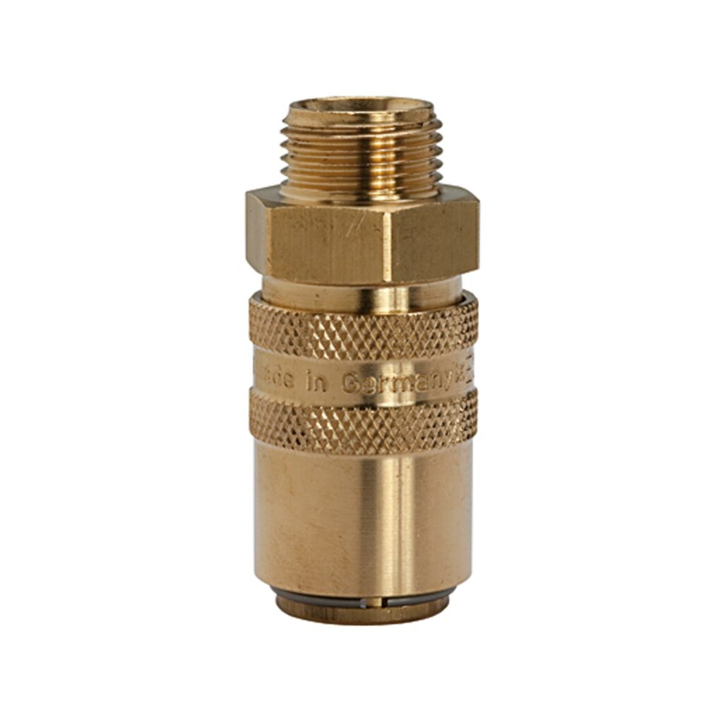 Temperierkupplung DN 6, Außengewinde, Absperrventil, MS, M14x1,5 gerade, PN max. 15 bar, Mediums-/Umgebungstemp. -20 °C bis 160 °C. Kompatibel mit System HASCO Z 8. Für Temperieranwendungen mit Heiß- oder Kaltwasser bzw. Temperieröl z.B. für Kühlkreisläufe an Kunststoffmaschinen. Wahlweise mit freiem Durchgang, einseitig oder beidseitig absperrend. Alle Außengewindekupplungen mit Innenkegel DIN 3863.