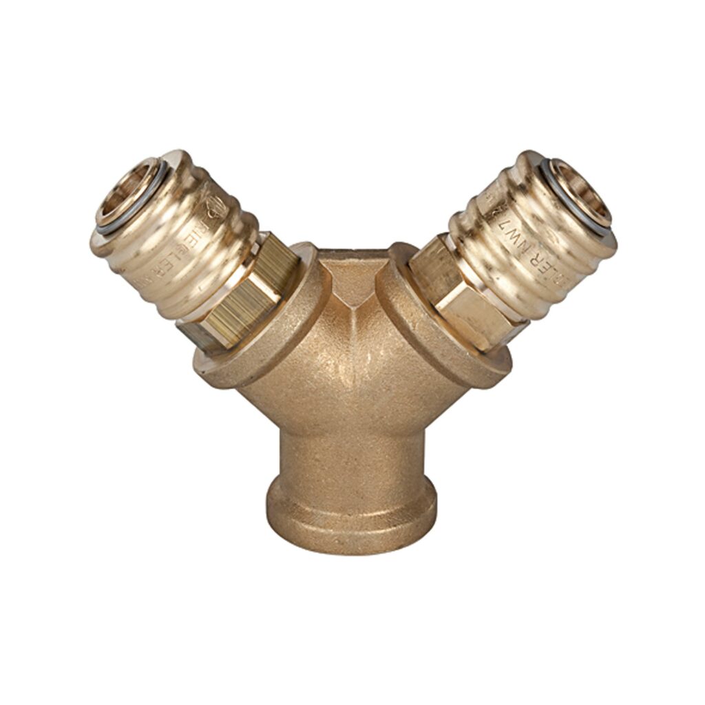 Verteiler mit 2 Schnellverschlusskupplungen NW 7,2, Messing blank, G 1/4 IG, Betriebsdruck 0 – 35 bar, Temp. -20 °C bis 100 °C. 1-, 2- bzw. 3-fach-Verteilerstücke aus Messing blank, fertig konfektioniert mit Schnellverschlusskupplung NW 7,2. Wahlweise mit Anschlussgewinde innen oder außen bzw. Stecknippel zum Adaptieren in eine bestehende Schnellverschlusskupplung NW 7,2 bis NW 7,8.