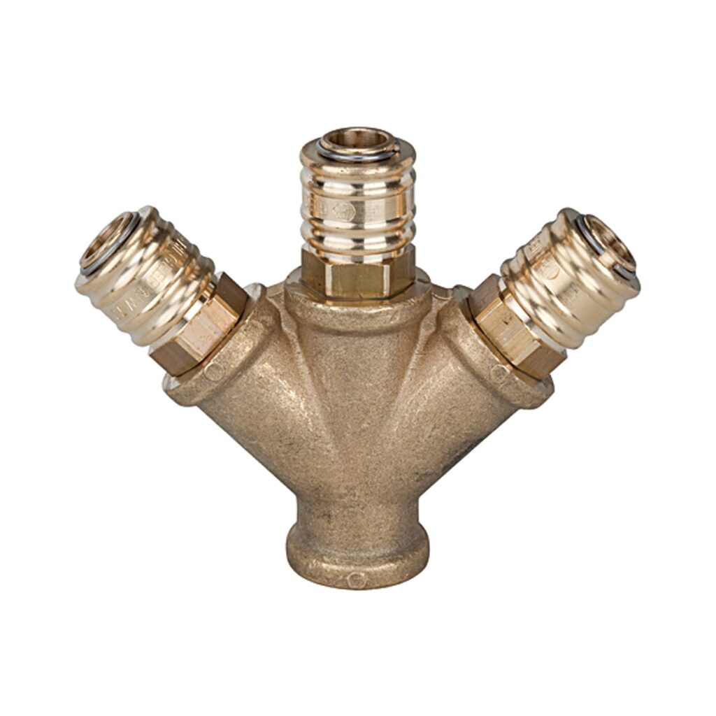 Verteiler mit 3 Schnellverschlusskupplungen NW 7,2, Messing blank, G 1/4 IG, Betriebsdruck 0 – 35 bar, Temp. -20 °C bis 100 °C. 1-, 2- bzw. 3-fach-Verteilerstücke aus Messing blank, fertig konfektioniert mit Schnellverschlusskupplung NW 7,2. Wahlweise mit Anschlussgewinde innen oder außen bzw. Stecknippel zum Adaptieren in eine bestehende Schnellverschlusskupplung NW 7,2 bis NW 7,8.