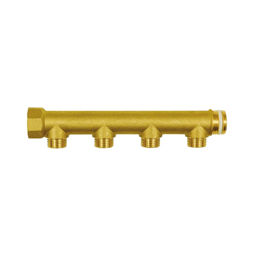 Verteilerrohr, 4 Abgänge, Eingang 2 x 3/4 mit PTFE-Dichtring, Ausgang 4 x Außengewinde 1/2, Messing. Zur Montage von Druckluft-Entnahmestellen. Endanschlüsse 1 x Außen- und 1 x Innengewinde, Abgänge wahlweise mit Außen- oder Innengewinde.