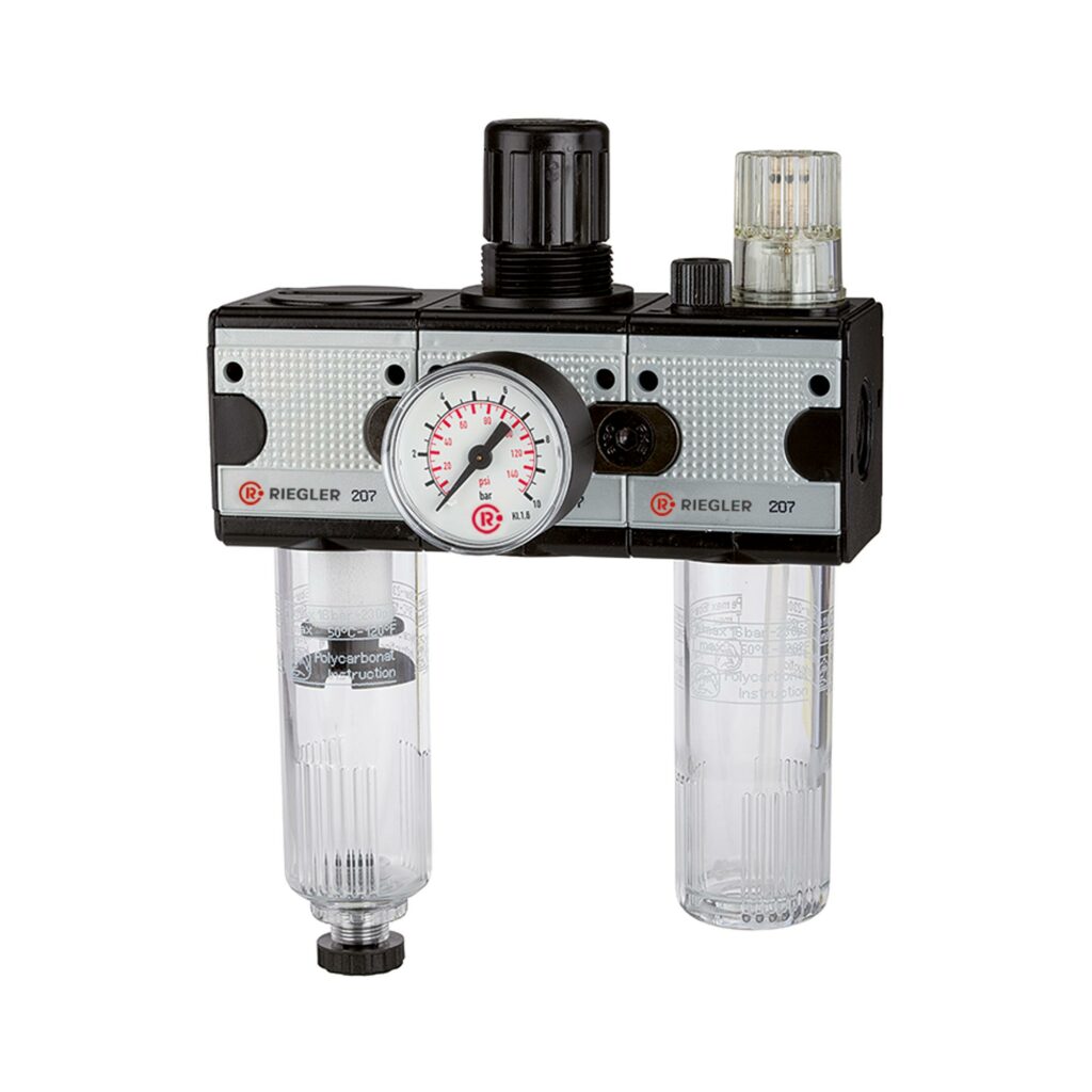 Wartungseinheit 3-tlg. »multifix« mit Polycarbonatbehälter, BG 1, G 1/4, Eingangsdruck max. 16 bar, Regelbereich 0,5 – 10 bar. Dreiteilige Wartungseinheiten, bestehend aus einem vordruckunabhängigen, rücksteuerbaren Membrandruckregler mit Sekundärentlüftung, einem Zentrifugalabscheider und einem Proportionalöler.