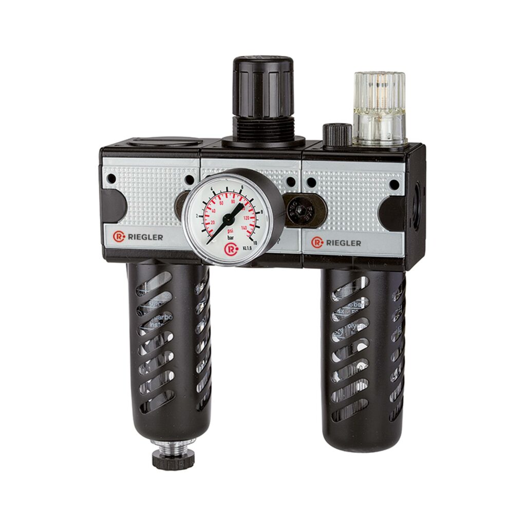 Wartungseinheit 3-tlg. »multifix«, PC-Behälter und Schutzkorb, BG 1, G 1/4, Eingangsdruck max. 16 bar, Regelbereich 0,5 – 10 bar. Dreiteilige Wartungseinheiten, bestehend aus einem vordruckunabhängigen, rücksteuerbaren Membrandruckregler mit Sekundärentlüftung, einem Zentrifugalabscheider und einem Proportionalöler.