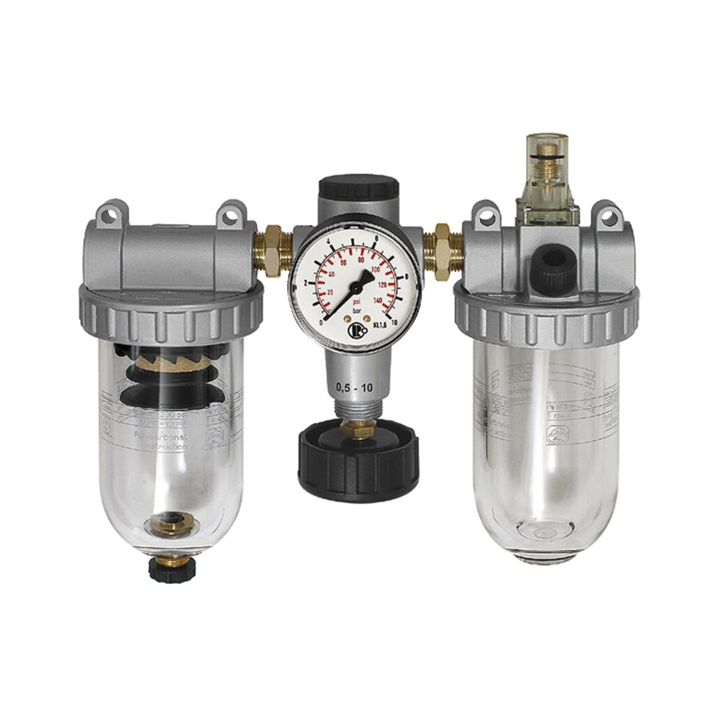 Wartungseinheit 3-tlg. »Standard« mit Polycarbonatbehälter, BG 1, G 1/4, Eingangsdruck max. 16 bar, Regelbereich 0,5 – 10 bar. Dreiteilige Wartungseinheiten, bestehend aus einem vordruckunabhängigen, rücksteuerbaren Membrandruckregler mit Sekundärentlüftung, einem Zentrifugalabscheider und einem Proportionalöler.