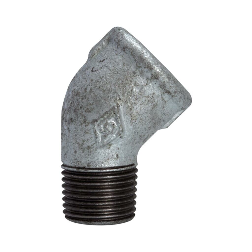 Winkel 121, 45°, IG/AG, Rp/R 3/8, Betriebstemperatur -20 °C bis 300 °C, schwarzer Temperguss, feuerverzinkt, DIN EN 10242. Nach DIN EN 10242 (vormals 2950). Die klassische und am weitesten verbreitete Verschraubungsserie im Rohrleitungsbau. Unsere Tempergussfittings zeichnen sich durch eine hohe mechanische Beanspruchbarkeit und durch eine Oberflächengüte nach DIN 2444 aus. Sie sind vollkommen mit einer Reinzinkschicht überzogen und somit trinkwassergeeignet sowie gegen Rost geschützt. Diese Tempergussfittings finden Verwendung im Maschinenbau, Außenleitungen, Kaltwasserleitungen und in Heizungsleitungen. Maximaler Einsatzbereich bei Minustemperaturen = -20 °C, 25 bar. Zulässiger Betriebsdruck bei Temperaturen zwischen -20 °C und 120 °C: 25 bar. Zulässiger Betriebsdruck bei Temperaturen zwischen 120 °C und 300 °C: 20-25 bar.