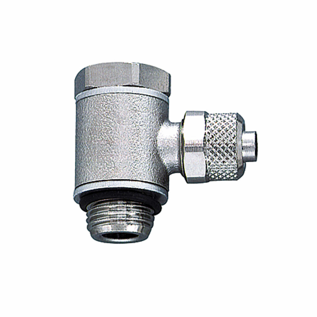 Winkel-Schwenkverschraubung mit O-Ring, M5 a., für Schlauch 5/3 mm, SW 8, Arbeitsdruck max. 18 bar, Messing vernickelt.