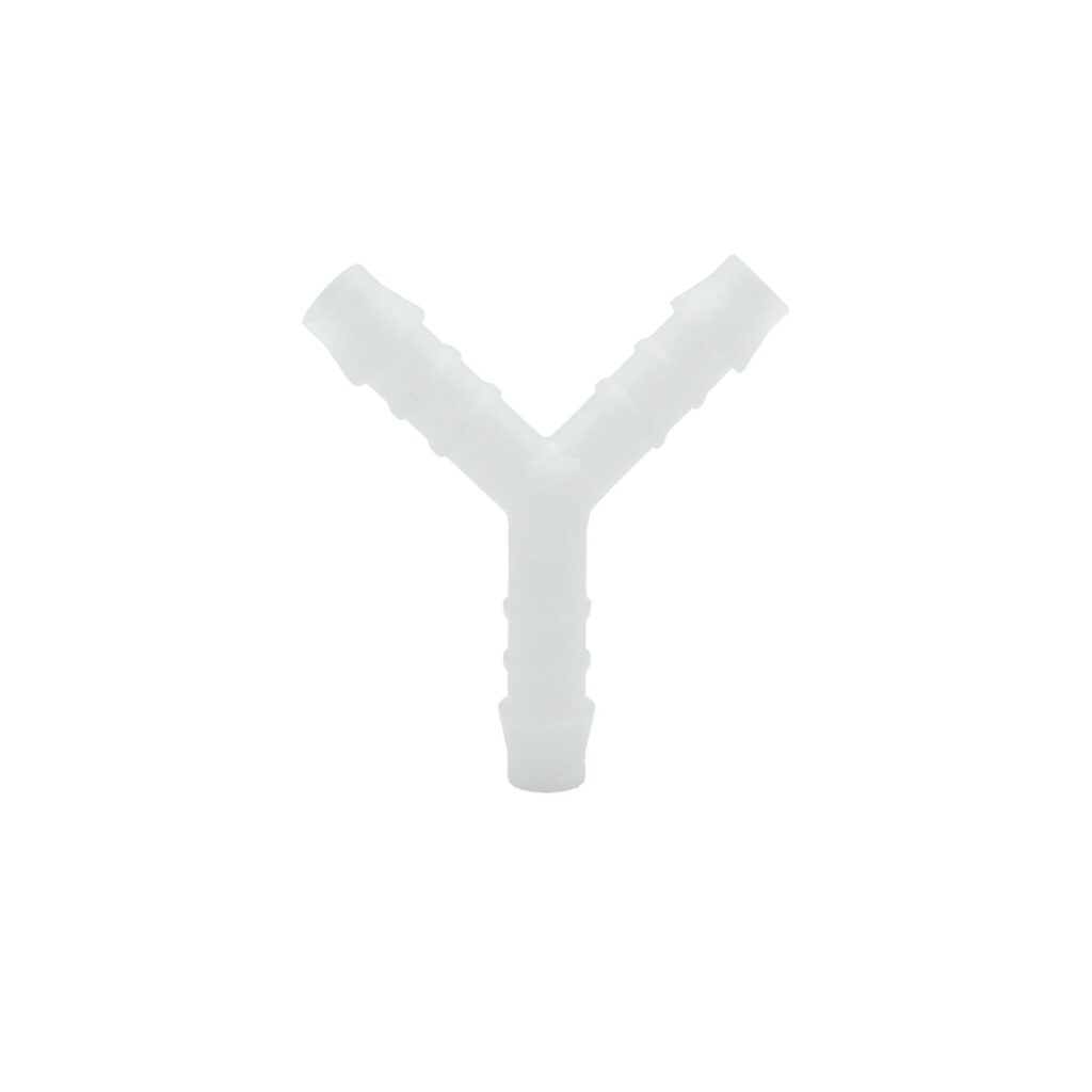 Y-Schlauchverbindungsstutzen, für Schlauch LW 3 mm, Winkel 90°, Arbeitsdruck max. 10 bar, Temperaturbereich -40 bis 80 °C, POM. Schlauchverbindungsteile mit hoher Festigkeit, Zähigkeit, geringem Gewicht, Abriebfestigkeit und großer Schlagfestigkeit.